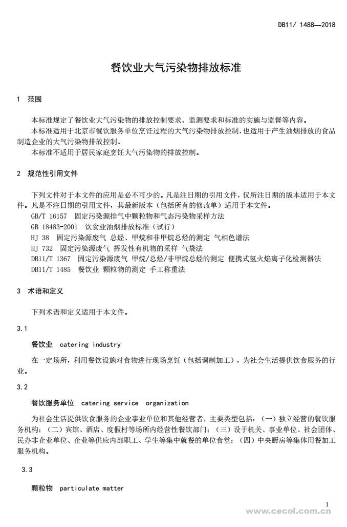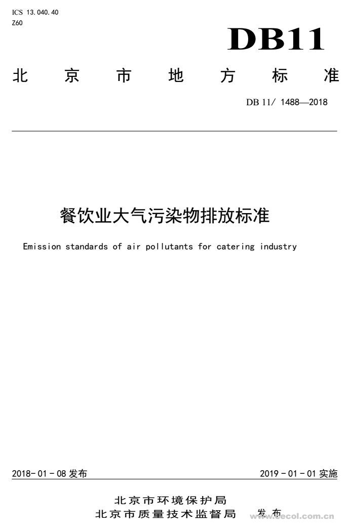 隨著社會經濟的發展和居民生活水平的提高,北京市餐飲業發展迅速,餐飲企業數量不斷增加、規模不斷擴大,餐飲業在烹飪過程中所產生的污染物排放也在不斷增加。為控制北京市餐飲業的大氣污染物排放,改善城市區域環境質量,引導和促進餐飲業污染治理技術進步,2018年1月8日,北京市制定并發布《餐飲業大氣污染物排放標準》(DB11/ 1488-2018)(以下簡稱“標準”)。