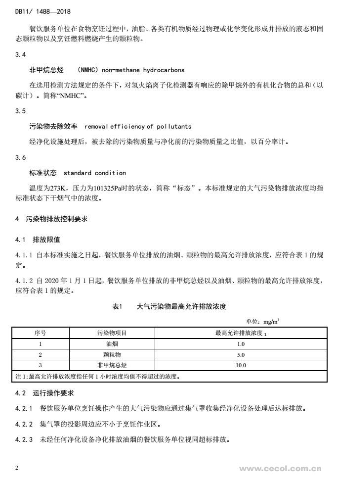 標準規定了餐飲服務單位排放的油煙、顆粒物和非甲烷總烴(注:“非甲烷總烴”為表征揮發性有機物,簡稱“VOCs”的指標)三項污染物的排放限值,明確了三項污染物的監測要求和分析測定方法,提出了凈化設備的運行操作要求,從而全面控制餐飲業的大氣污染排放。該標準于2018年1月8日發布,并將于2019年1月1日起實施,其中油煙和顆粒物限值自標準實施之日起執行,非甲烷總烴限值自2020年1月1日起執行。